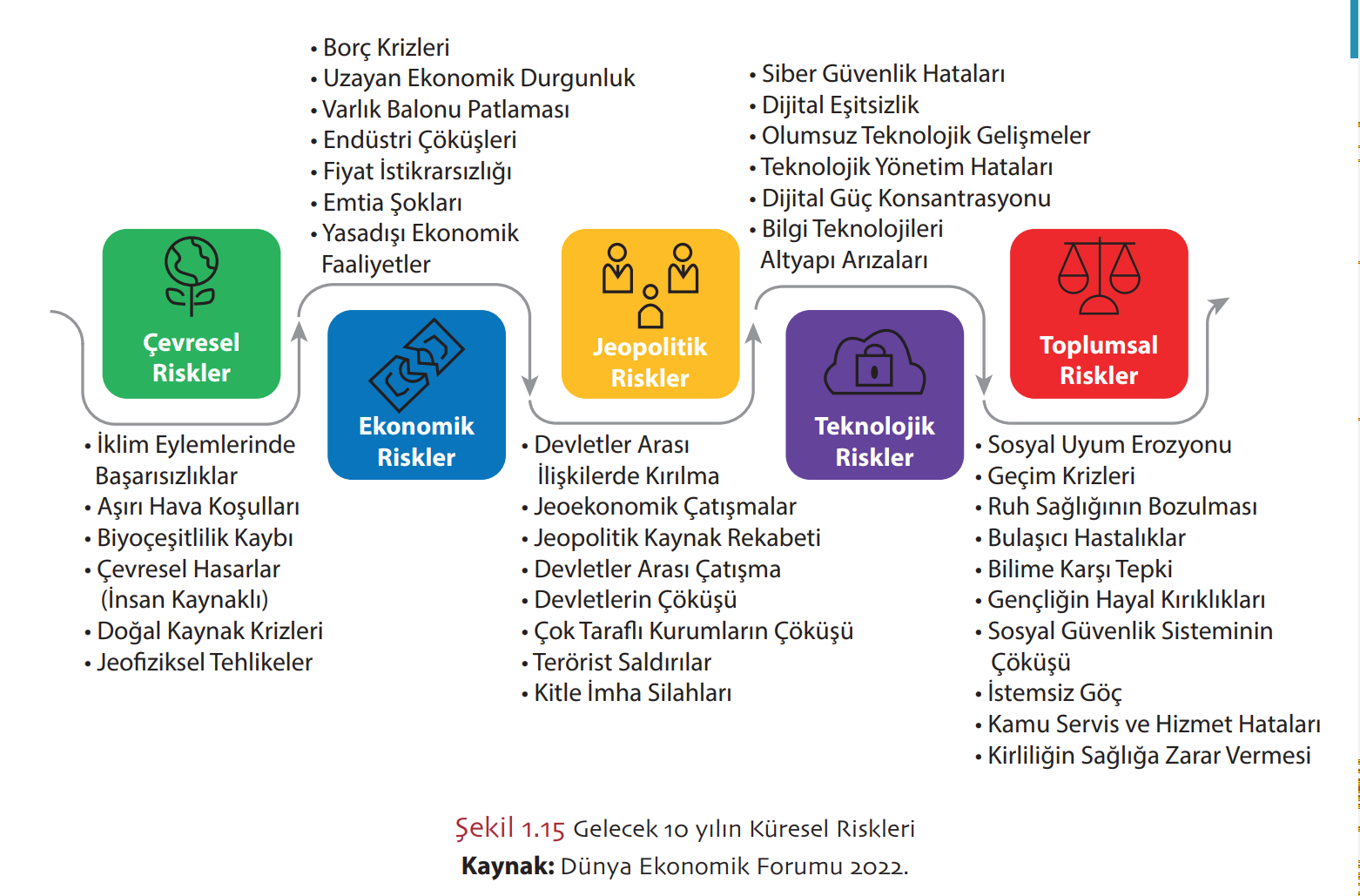Jeofiziksel tehlikeler Dünya Ekonomik Forumu’nun (DEF) yayınladığı “2022 Küresel Riskler” raporunda yer alan çevresel risklerden biridir. Doğru yanıt E seçeneğidir.