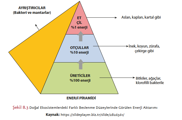 Ekosistemlerdeki birincil besin üretimi bitkiler tarafından alınan güneş ışığı, mineral ve su teminine bağlıdır. Bir ekosistemdeki besin ve enerji akışını göstermek için enerji piramidi denilen grafik gösterimden yararlanılır. Bir enerji/besin piramidi; üreticilerin yer aldığı en alt beslenme düzeyinde tüketicilerin yer aldığı, en üst yırtıcı etçil seviyesine kadar tüm besin seviyelerinin enerji miktarını göstermektedir. Besin piramidinde üreticilerden itibaren yukarı doğru her beslenme düzeyinden yaklaşık %90 oranında enerji kaybı olduğu için bir üst beslenme düzeyine toplam enerjinin ancak %10 kadarı aktarılabilmektedir. Bu nedenle etçil grubunda yer alan canlılar tüm enerjinin sadece %1 ini alırlar. Bu düzeydeki canlılar arasında aslan, kaplan, kartal gibi etçil canlılar yer almaktadır.