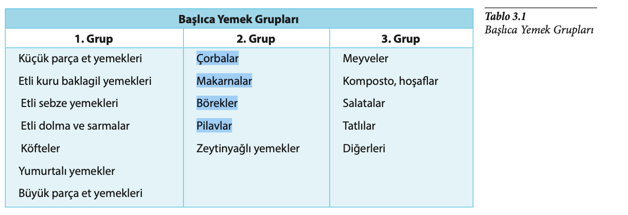 Menü kartında yer alacak yiyecek ve içecek gruplarının sıralanışı