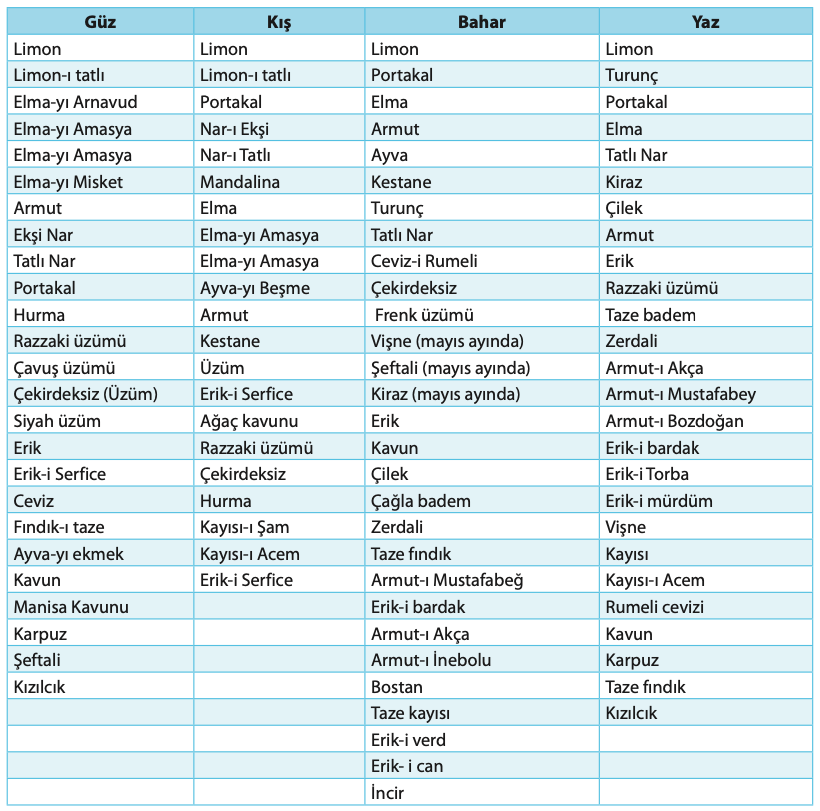 Meyve kuruları ve yemişler bol miktarda tüketilmektedir.