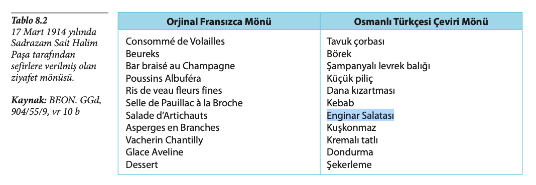 Amerikan kökenli domates, yeşil ve kırmızı biber, patates, mısır, fasulye gibi sebzeler ve yenibahar, vanilya gibi tatlandırıcıların mutfakta kullanımının yaygınlaşması; Avrupa’yla artan ticaretin etkisiyle konserve ve paketlenmiş̧ gıda ürünlerinin İstanbul piyasasına girişi; alafranga sofra düzeni ve adabının seçkin çevrelerde kabulü ve uygulanması; yeni sofra düzeniyle birlikte Avrupa’dan ithal ve daha sonra yerel porselen takımların kullanımının başlaması; 1880’lerden itibaren Fransız kökenli alafranga yemek teknik ve çeşitlerinin seçkin İstanbul mutfağına girmesi ve sos, garnitür, pasta, krema gibi bazı tekniklerin yerel mutfağa adapte olması; geçmiş̧ yüzyılların birikimiyle İstanbul’da farklı cemaatler tarafından paylaşılan zengin mutfak kültürünün şekillenmesi ve bu mutfağın yemek kitapları aracılığıyla gelecek kuşaklara aktarılması.
