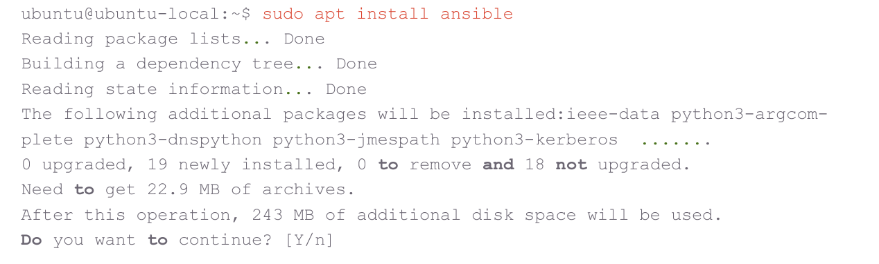ubuntu@ubuntu-local:~$ echo "ansible ALL=(ALL) NOPASSWD:ALL" | sudo tee /etc/ sudoers.d/ansible