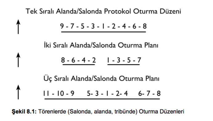 Resmi taşıtlarda oturma düzeninde protokol sırası: 1. yer arka sağ, 2. yer arka sol, 3. yer ön sağdır.