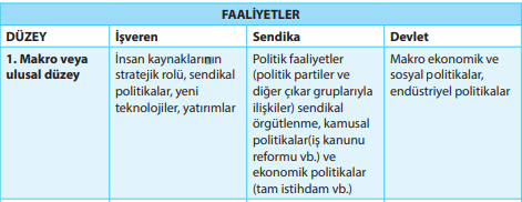 Makro veya ulusal düzeyde işveren faaliyetleri içerisinde insan kaynaklarının stratejik rolü, sendikal politikalar, yeni teknolojiler, yatırımlar bulunmaktadır.