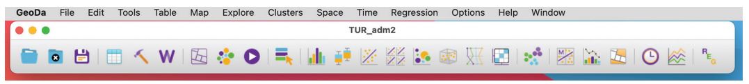 Aşağıda sunulan görselde, GeoDa yazılımının işlevler için tanımlı farklı menüleri bulunmaktadır. Menüde yer alan