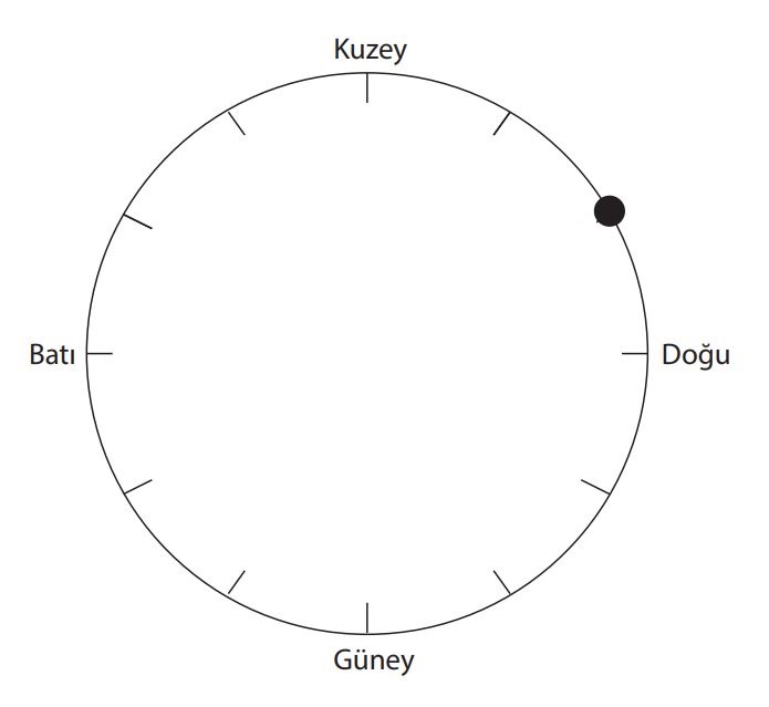 Şekildeki dairede her iki cephe arasında 90°'lik açı bulunmaktadır. Saat yönünün tersine, Batı yönünden Güney yönüne doğru gelinen her bir nokta 30°'ar dereceyi temsil etmektedir. Batı yönünden Doğu yönüne 180° ve işaretli alana da 180+30=210°'ye ulaşılmaktadır. Doğru yanıt D seçeneğidir.