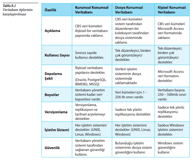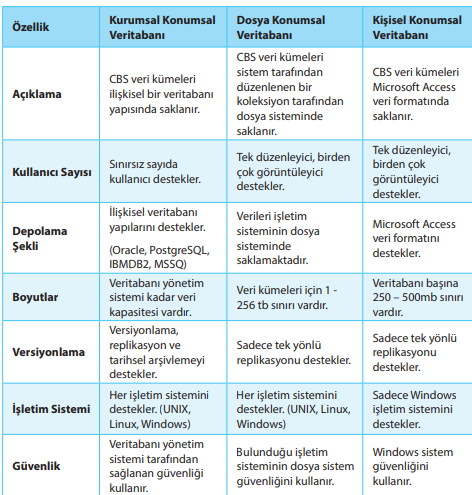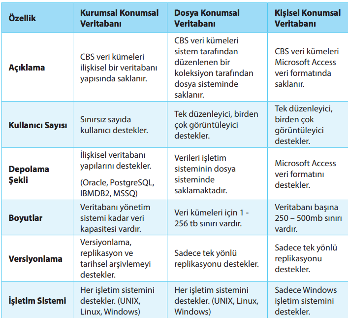 Veri boyutu büyük ve tek kullanıcı varsa en uygun olanı dosya konumsal veritabanıdır. Kişisel konumsal veritabanı da tek kullanıcı için uygundur fakat veri boyutu küçük olduğunda tercih edilmelidir. Diğer sayılan veri tabanları ise çok sayıda kullanıcı olması halinde uygundur.