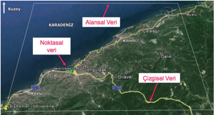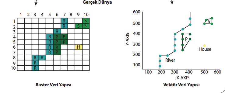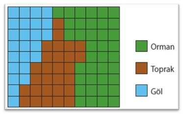 Şehirler, binalar gibi sınırları belirli nesneler poligonlarla gösterime uygundur. Nehir, karayolu, akarsular ise çizgilerle gösterilir.