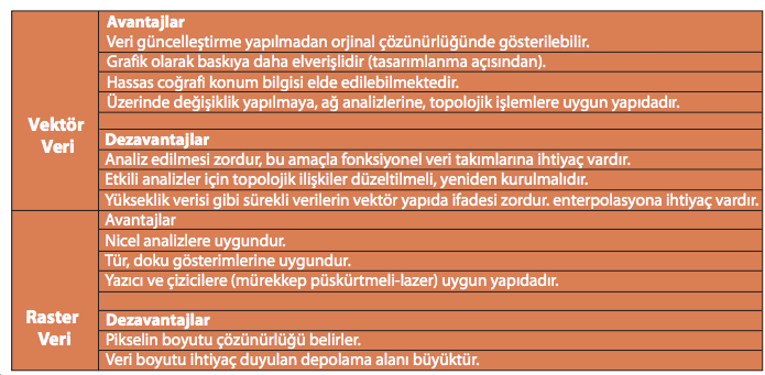 Vektör verilerin boyutları raster verilere göre daha küçüktür. Diğer seçeneklerdeki avantajlar ise raster veri türüne aittir. Raster veri yapısı, vektör veriye göre daha basittir. Bazı konumsal analizleri (çakıştırma, yakınlık vb) raster verilerle yapmak daha kolaydır. Raster veri tür, doku gösterimlerine ve nicel analizlere uygundur.