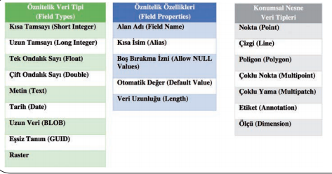 Konumsal nesne tabloları nokta (point), çizgi (line), poligon (polygon), çoklu nokta (multipoint), çoklu yama (multipatch), etiket (annotation) ve ölçüm (dimension) olarak oluşturulabilmektedir.