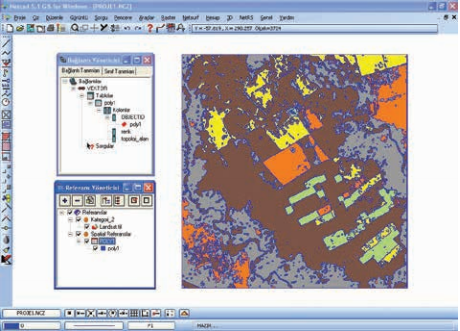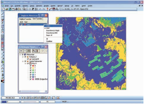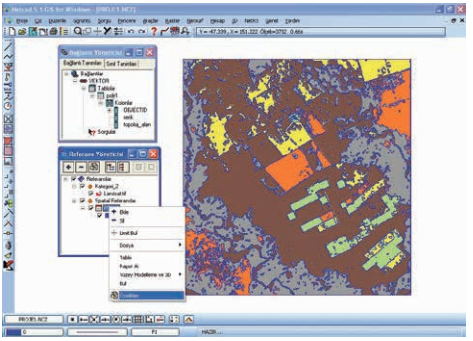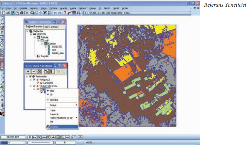 Adım 1: “Vektörizasyon” işlemi sonucunda elde edilen vektör veriler üzerinde istenilen renklerde tematik harita oluşturmak için, “Referans Yönetici” komut penceresi açılır. Pencerede yer alan “Spatial Referanslar/POLY1” düğmesi üzerinde farenin sağ tuşuna basıldığında açılan menüden “Özellikler” seçilir.