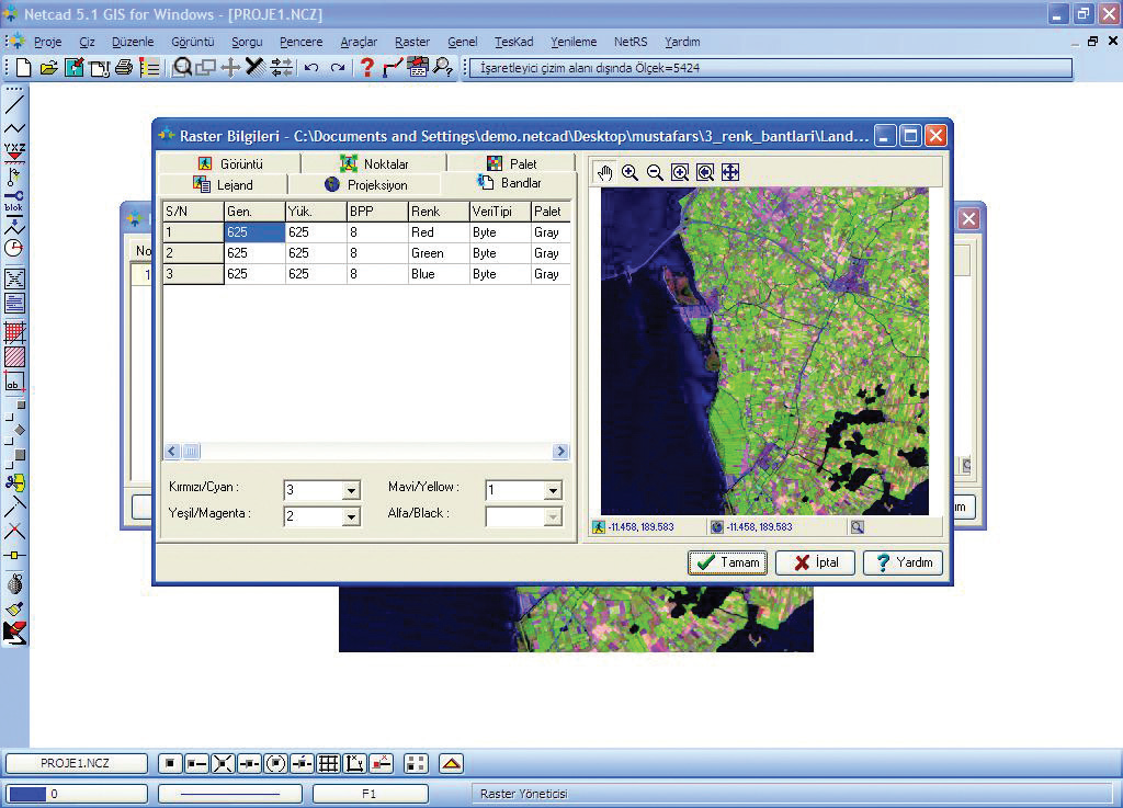 Uydu görüntüleri vector veri olarak işlemlere katılır.