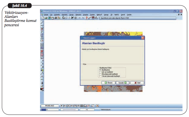 Ekrandaki raster veri komut penceresine eklendikten sonra Açılan pencerede, sınıflara ait kapalı alanları oluşturmak için, basitleştirme kriterlerinin bulunduğu kısım yeralacaktır. Basitleştirme derecesi, oluşan alanlardaki nokta sayısını azaltarak hatların sadeleşmesini sağlar. Alanları basitleştirme kriterlerinden “Basitleştirme” seçilir ve “Sonraki” düğmesine basılarak işleme devam edilir. Açılan pencerede “Delik alan topolojilerini düzelt” komutu aktif edildiğinde oluşan iç içe alanlarda, içteki alanı dıştakinden çıkartır ve iç alanı ayrı bir alan olarak yeniden tanımlar. “Sonraki” butonu ile işleme devam edilir.