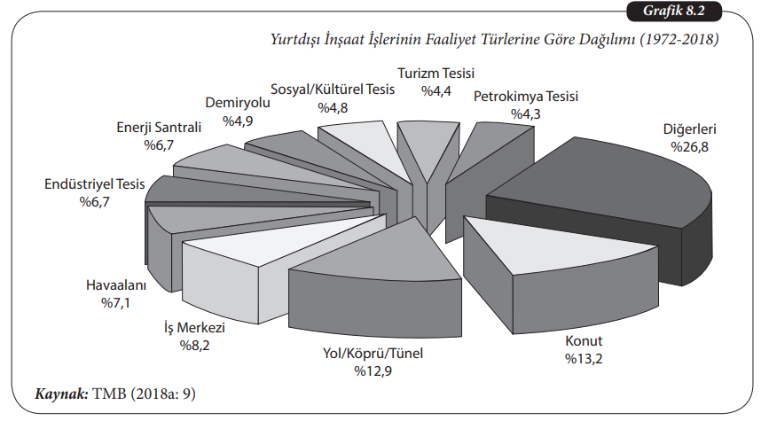 1972-2018 döneminde, yurtdışı inşaat işlerinin faaliyet türlerine göre dağılımında konut %13,2 ile birinci sırada iken; %12,9 oranında Yol -köprü-tünel ikinci sırada ve % 8,2 ile iş merkezi inşaatları üçüncü sırada yer almaktadır. Doğru yanıt A’dir.