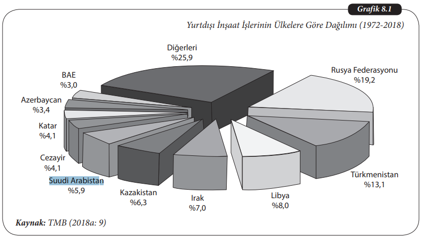 Günümüzde Türk inşaat işletmeleri tarafından yurt dışında gerçekleştirilen inşaat işlerinin ülkelere göre dağılımı incelendiğinde, Rusya Federasyonu’nun %19,2’lik payla ilk sırada yer aldığı görülmektedir.