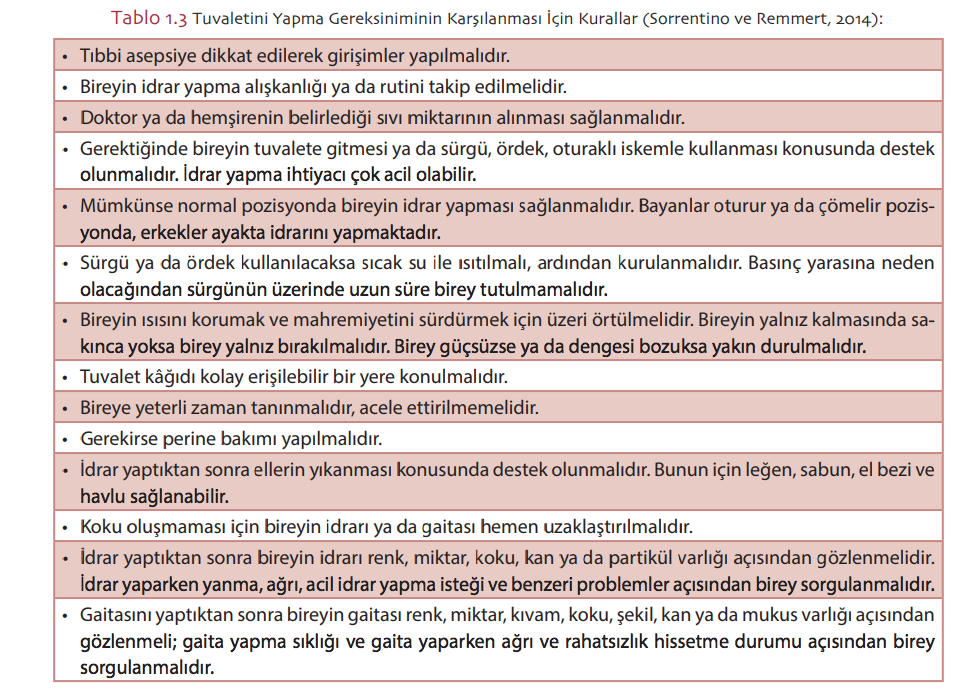 Tuvalet ihtiyacını gidermede yardım edilmesi ve gerektiğinde temizliğinin yapılması