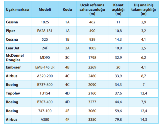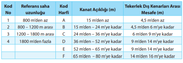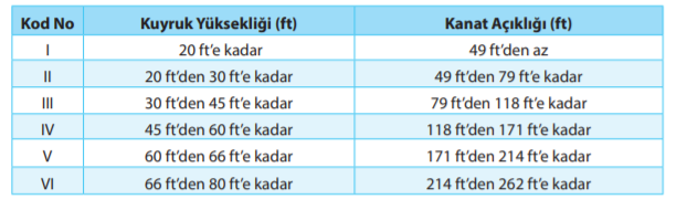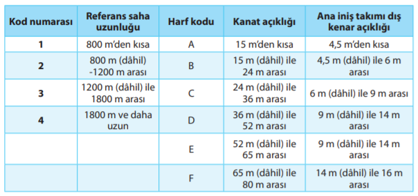 Kod No Referans saha uzunluğu Kod Harfi Kanat Açıklığı (m)