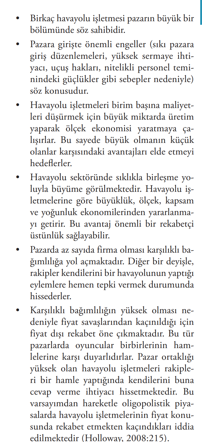 Birbirlerinin kararlarından etkilenebilecek az sayıda satıcının, çok sayıda alıcı ile karşı karşıya geldiği piyasa türüne oligopol piyasa adı verilir. Oligopol piyasalara örnek olarak genellikle yüksek sermaye yatırımlarının gerektiği demir-çelik, otomobil, beyaz eşya, havayolu işletmeleri verilebilir. Havayolu işletmeleri oligopol piyasalarda faaliyet göstermektedirler. Pazarda az sayıda havayolu işletmesi trafiğin büyük bir bölümünü taşımaktadır. Doğru cevap E seçeneğidir.