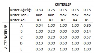 karar matrisindeki orijinal değerler ortak bir ölçeğe dönüştürülmelidir. Bu amaçla geliştirilecek