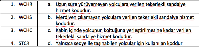 Yolcu hizmetleri kapsamında verilen hizmetlerin, Sivil Havacılık Genel Müdürlüğünün yer hizmet türlerini ve detaylarını belirlediği Havacılık Talimatına (SHGM, 2017) göre, aşağıdakilerden hangisi yanlıştır?