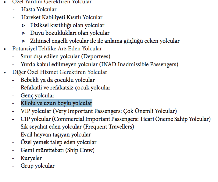 • Özel Hizmet Gerektiren Yolcular: Hasta, hareket kabiliyeti kısıtlı, çocuk, tutuklu, yurda kabul edilmeyen ya da sınır dışı edilen yolcu ve önemli kişiler ile diğer özel hizmet gerektiren yolculara verilen hizmetleri kapsamaktadır.