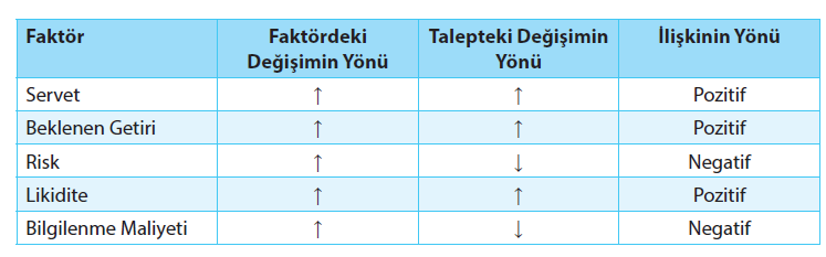 Varlık talebini etkileyen faktörler ile varlık talebi arasındaki ilişkiyi yansıtan ifadelerden hangisi doğru değildir?