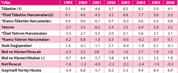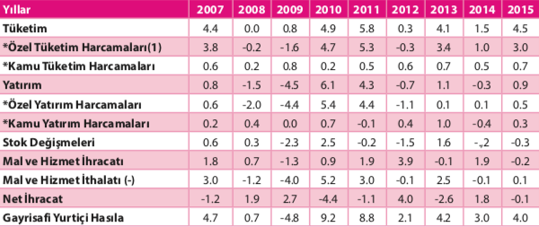 Toplam talep bileşenlerinin 1999-2015 yılları arasında iktisadi büyümeye yaptığı katkılar Tablo 8.8’de görülmektedir.Türkiye'de iktisadi büyümeye en fazla katkı yapan bileşenlerin özel tüketim ve özel yatırım harcamaları olduğu anlaşılmaktadır.