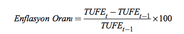 Enflasyon Oranı= (Cari Yılın TÜFE değeri - Bir yıl Önceki TÜFE değeri) / (Bir yıl Önceki TÜFE değeri) x 100 dür.