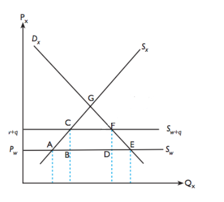 Ekonomik etkinsizlik iki nedenle ortaya çıkmaktadır. İlk neden, üretim faktörlerinin karşılaştırmalı üstünlüğe sahip olunan malların üretiminden karşılaştırmalı üstünlüğe sahip olunmayan malların üretimine aktarılmasıyla ortaya çıkan üretim sapma maliyetidir. İkinci neden ise tüketicilerin ilgili malları dünya fiyatından daha yüksek iç fiyattan satın almak durumunda kalmalarından kaynaklanan tüketim sapma maliyetidir. Doğru cevap A seçeneğidir.