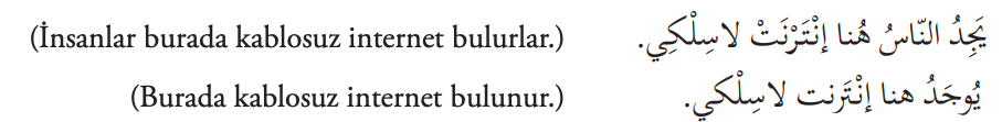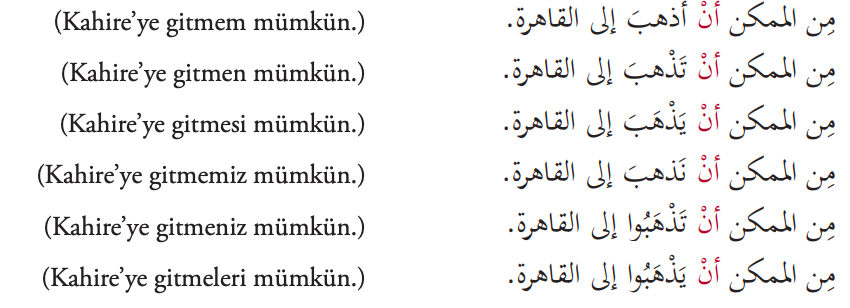 Arapça muzâri bir fiilin geniş zaman ile şimdiki zaman anlamlarından hangisini ifade etmesi isteniyorsa cümlede buna uygun bir zaman zarfı kullanıldığını da hatırlayalım. Cümle başında veya fiilden sonra kullanılabildikleri gibi genellikle cümle sonunda kullanılan bu tür zaman zarflarından örneğin (اَﻻَنْ:şimdi), (َاَلْيَوْمَ:bugün) ve (حَاﻻً:hemen) şimdiki zamana özgüdür. (عَادَةً:genellikle) veya (كُلّ:her) sözcüğünden sonra gelen zaman ifadeleri geniş zamana özgüdür.