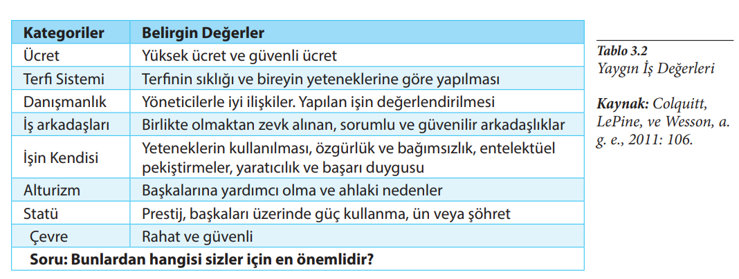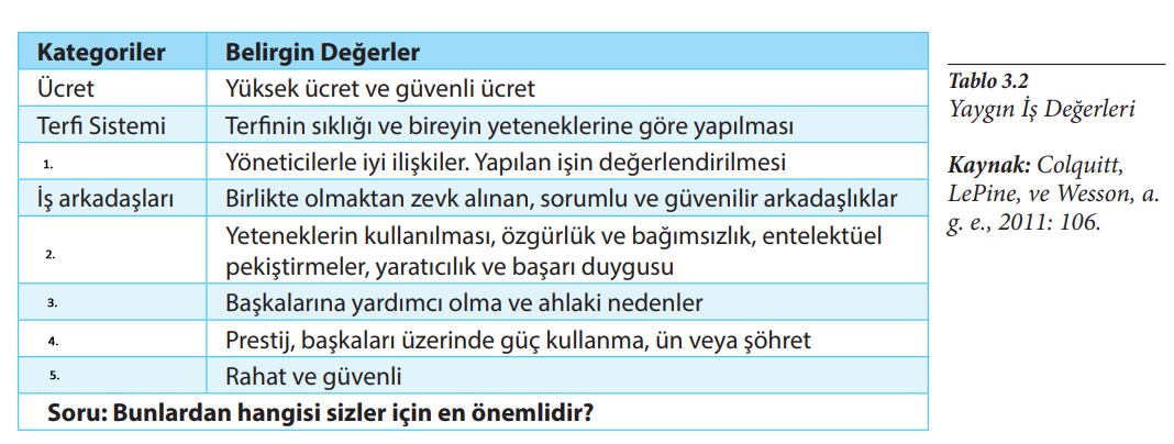 Yaygın olarak çalışma hayatına ilişkin beklentilerde anlamını bulan değerlerden başlıcaları şöyle sıralanabilir: