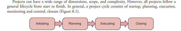 Projects can have a wide range of dimensions, scope, and complexity. However, all projects follow a general lifecycle from start to finish. In general, a project cycle consists of startup, planning, execution, monitoring and control, closure (Figure 8.1).