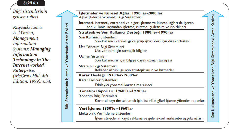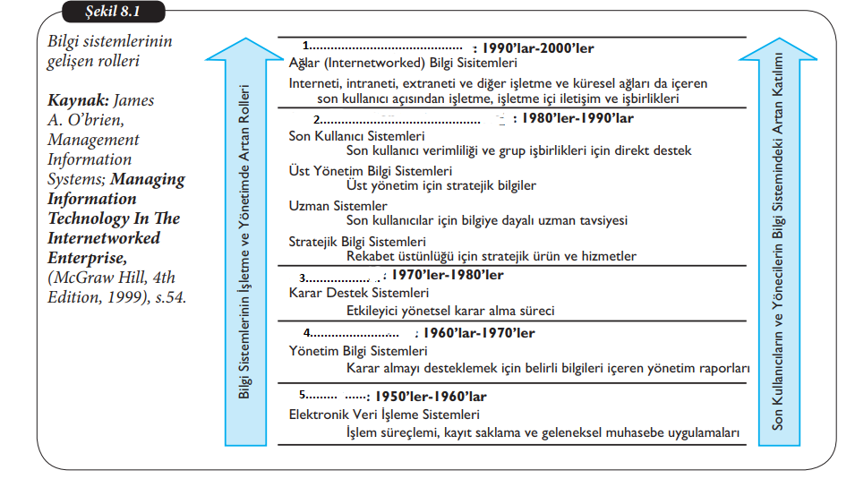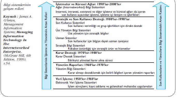 Bilgi sistemlerinin gelişim kronolojisine baktığımızda 1980’li yıllarla beraber birçok değişimin yaşandığını gözlemlemekteyiz. 1980’li ve 1990’lı yıllarda yaşanan değişimler genel olarak, son kullanıcı verimliliği ve grup işbirlikleri için direkt destek, üst yönetim için stratejik bilgiler, son kullanıcılar için bilgiye dayalı uzman tavsiyesi ve rekabet üstünlüğü için stratejik ürün ve hizmetler olarak özetlenebilir. Öte yandan, interneti, intraneti, extraneti ve diğer işletme ve küresel ağları da içeren son kullanıcı açısından işletme, işletme içi iletişim ve işbirlikleri 1990’lı yıllardan 2000’li yıllara giden süreçte tecrübe edilmiş bir değişimdir.