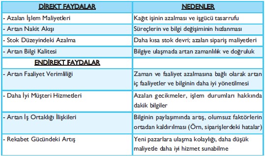 EVD’lerin sağladığı direkt ve endirekt faydaların arkasında kimi nedenler bulunmaktadır. EVD’lerin sağladığı direkt faydaların arkasında yatan nedenlere baktığımızda karşımıza kâğıt işinin azalması ve işgücü tasarrufu, süreçlerin ve bilgi değişiminin hızlanması, daha kısa stok devri ve azalan sipariş maliyetleri ve son olarak da bilgiye ulaşmada artan zamanlılık ve doğruluk çıkmaktadır. Öte yandan, azalan gecikmeler, işlem durumları hakkında dakik bilgiler EVD’lerin endirekt faydalarından olan daha iyi müşteri hizmetleri sunulmasının arkasında yatan bir neden olarak ortaya çıkmaktadır.