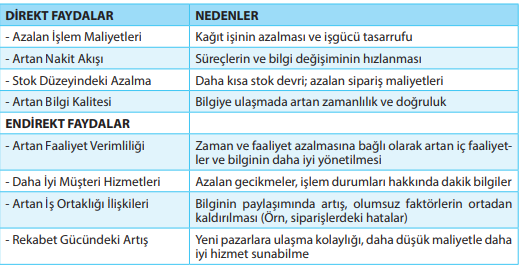 Aşağıdaki tabloda EVD’nin direkt ve endirekt faydaları listelenmiştir.