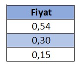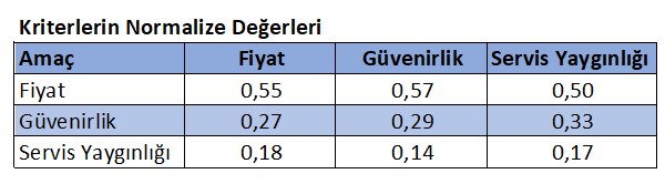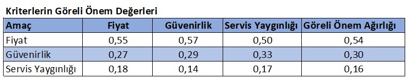 Fiyat için Göreli Önem Ağırlığı= 1.Satır Ortalaması=0,54Güvenirlik için Göreli Önem Ağırlığı= 2.Satır Ortalaması=0,30