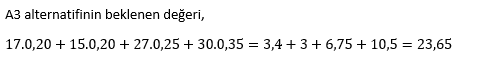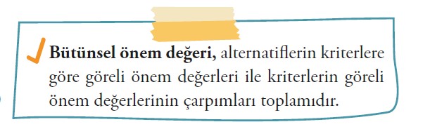 alternatiflerin kriterlere göre göreli önem değerleri ile kriterlerin göreli önem değerlerinin çarpımları toplamıdır