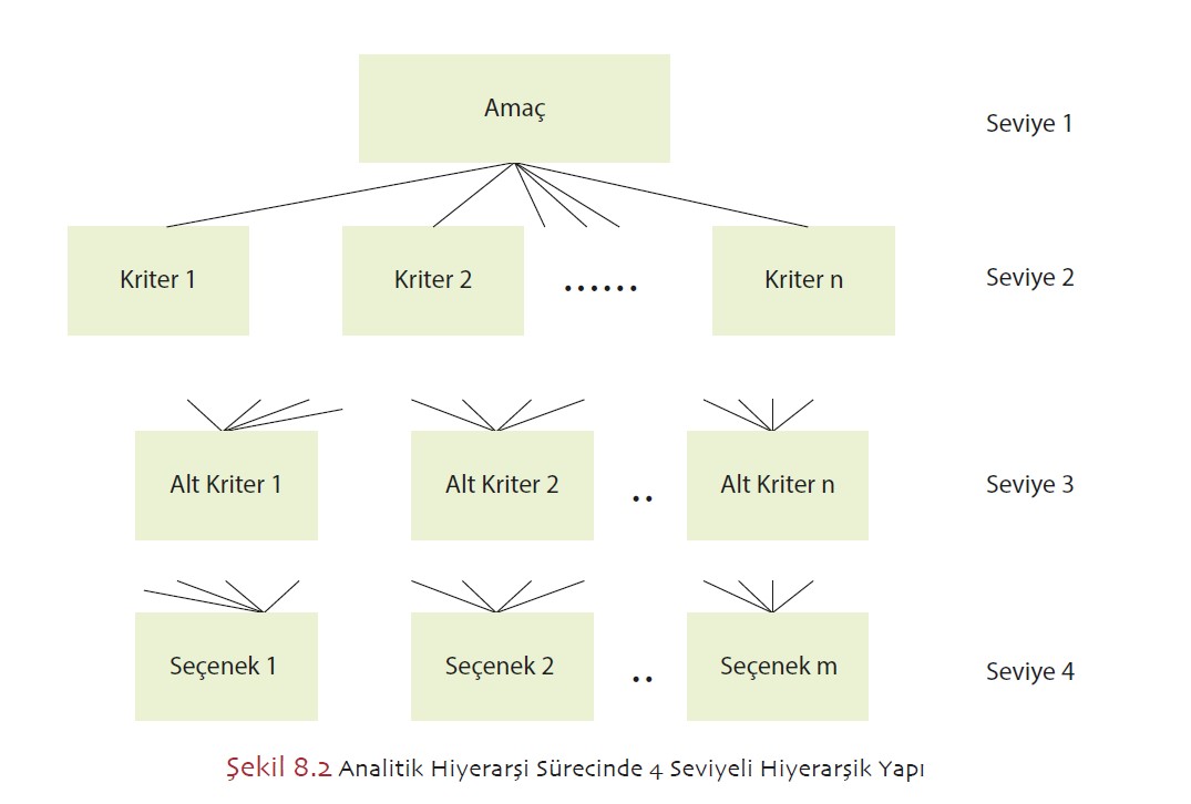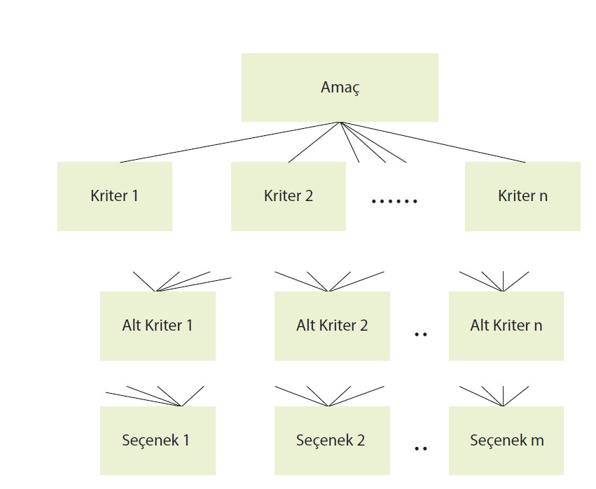 Problemimiz amaç, kriterler ve alternatifler olmak üzere üç seviyeli bir hiyerarşik yapı ile gösterilir.
