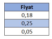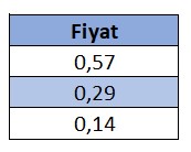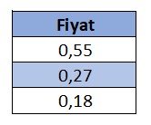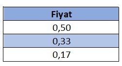 Fiyat için: 1/1.Sütun Toplamı=1/1,8=0,551/2=0,5 0,5/1.Sütun Toplamı= 0,5/1,8=0,27
