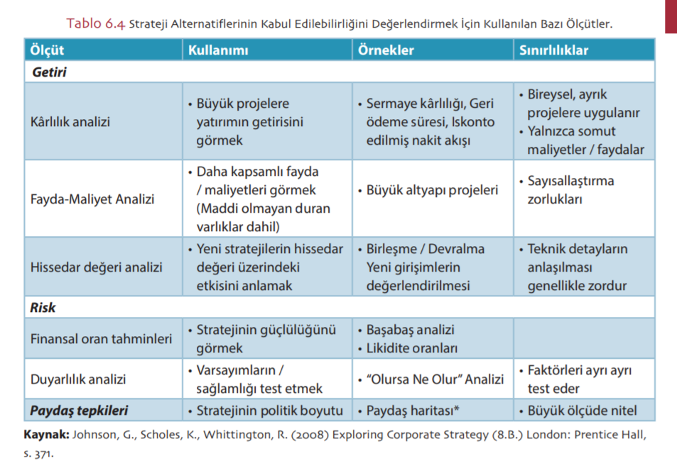 • Strateji alternatiflerinin geliştirilmesi, değerlendirilmesi ve seçimi