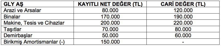KLM Anonim Şirketi GLY Anonim Şirketini devralacaktır. GLY AŞ.’nin 31 Aralık tarihli bilançosundaki maddi duran varlıkların kayıtlı değeri ve daha önceden hesaplanan cari değerleri tablodaki gibidir. GLY AŞ.’nin kayıtlı özsermayesi 120.000 TL ve devir değeri 400.000 TL olduğuna göre devralma sırasında oluşacak şerefiye kaç TL’dir?Seçenekler