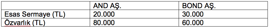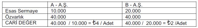 Bu sonuca göre, birleşen işletmelerden AND AŞ.’nin bir payı BOND AŞ.’nin iki payına eşittir. Bu durumda; Değiştirme Birimi = Devrolan işletmenin hisse senedinin cari değeri / Devralan ortaklığın hisse senedinin cari değeri = 2 / 4 = 0,5 olacaktır.