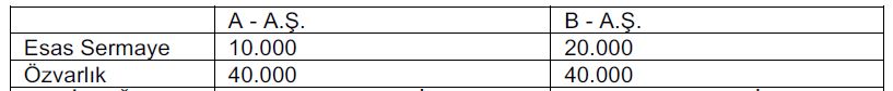 Doğru yanıt E seçeneğidir. Kayıtlar yapılmadan önce, şirketin devir koşullarına göre öz sermayesi ve buna bağlı olarak “Birleşme kâr veya zararı” saptanmalıdır.