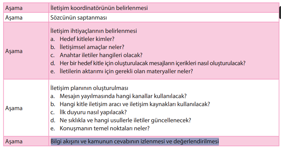 Salgın durumunda kitle iletişiminde aşamalar sırasıyla (1)iletişim koordinatörünün belirlenmesi, (2)sözcünün saptanması, (3)iletişim ihtiyaçlarının belirlenmesi, (4)iletişim planının oluşturulması ve son olarak (5)bilgi kışını ve kamunun cevabının izlenmesi ve değerlendirilmesidir.