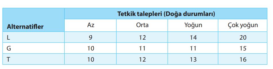 - Sorudaki çizelgede, bir maliyet probleminde iyimserlik kriterine göre optimal çözüm değeri, aşağıdakilerden hangisidir?