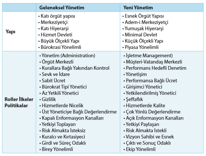 Geleneksel kamu yönetimi (public administration), göreceli olarak verimlilikle az ilgilenmekte; demokrasi, hesap verebilirlik, kamu yararı, eşitlik, dürüstlük gibi özellikle kamu sektörünün değerleri üzerine daha fazla vurgu yapmaktadır.