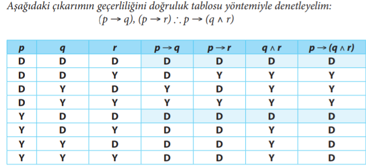 Çıkarımın sonuç önermesi doğru ise, öncüllerden en az biri doğru olmalıdır.