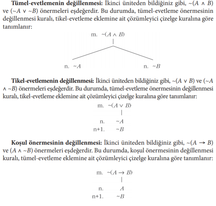 değillenmesi kurallarını ve önerme eklemlerine ait kuralları uygulayarak ilerleriz.