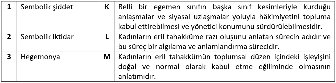 1970’li yıllarda feminist hareketin çabasıyla dikkat çekilen kadına karşı şiddetle mücadelede şiddetin belgelenmesi, sığınmaevlerinin, 24 saat ulaşılabilir kriz hatlarının açılması, sorunun önlenmesini amaçlayan kurumsal ve yasal düzenlemelerin hayata geçirilmesiyle önemli adımlar atılmaya başlanmıştır. Ancak yasal olarak eşit hakların düzenlenmiş olmasına rağmen kadının yasal haklarına ilişkin bilgiye erişiminin engellenmesi, uygulamada kadın aleyhine verilen hukuki kararlar, hukuki yaptırımlarda erkek lehine verilen indirimler, erkek şiddetinin ve kadın üzerinde kurduğu iktidarın pekişmesine neden olmaktadır. Doğru cevap D'dir.