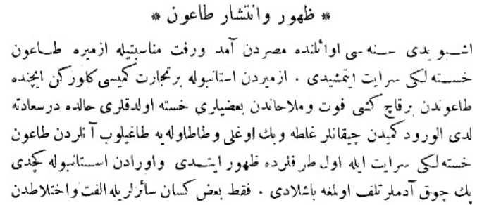 "İşbu yedi (Hicri 1227) senesi evâ’ilinde Mısır’dan âmed ü reft münâsebetiyle İzmir’e tâ‘ûn hastalığı sirâyet itmiş-idi."